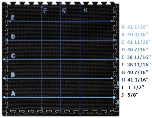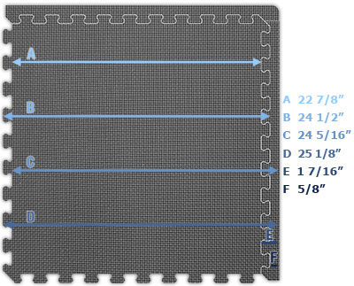 - Because of the interlocking nature & edge padding, sizes are not exact and are reduced by approximately 1.5%. See 2' x 2' x 7/8" and 40" x 40" x 7/8" size details